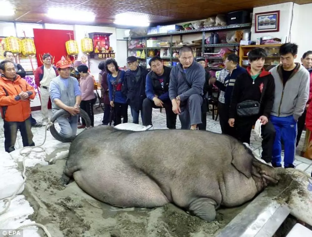 Свинья весом почти в тонну (936 килограммов) выиграла конкурс, который ежегодно проводится в даосском храме в городе Синьбэй на Тайване. По давней традиции, в конкурсе участвуют местные фермеры, которые откармливают животных. Побеждает то, которое окажется самым тяжелым, пишет издание Shanghai Daily. Свинью-победительницу торжественно провозят по всему городу, а затем публично приносят в жертву богам. Ей перерезают горло, а из мяса готовят различные блюда. Крестьянин, вырастивший самый тяжелый экземпляр, получает награду от монахов - небольшой слиток золота. В последние годы данный обряд подвергается нешуточной критике со стороны защитников прав животных. Общественные активисты требуют отменить "жестокий и оскорбительный" конкурс. По их словам, свиней содержат в тесных загонах, где они совершенно не могут двигаться, и насильно заставляют есть.