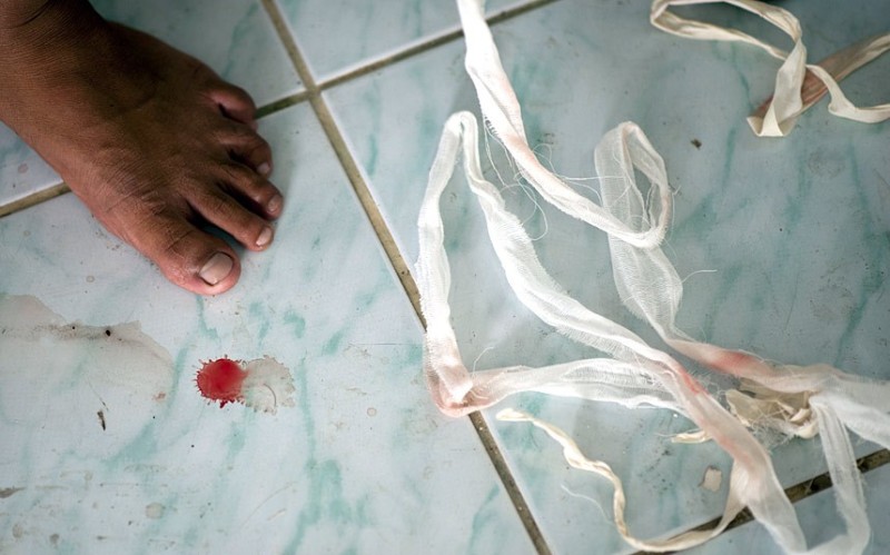 Кровь стекает по перчаткам заключенного во время перерыва между раундами.