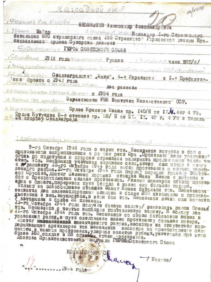 Звание можно было получить дважды и даже трижды. За это, помимо грамот и орденов, на родине героев устанавливали их бронзовые бюсты. Трижды звания "Герой Советского Союза" были удостоены лишь три человека – один из первых маршалов Семен Буденный и летчики-асы Иван Кожедуб и Александр Покрышкин. Трижды героем мог стать и боец из Восточного Казахстана Александр Несмиянов - командир 1-го стрелкового батальона 690-го стрелкового полка 126-й стрелковой Горловской Краснознаменной дивизии 2-й Гвардейской армии. TengriMIX расскажет, за какие подвиги Александра Несмиянова неоднократно представляли к самой высокой награде.