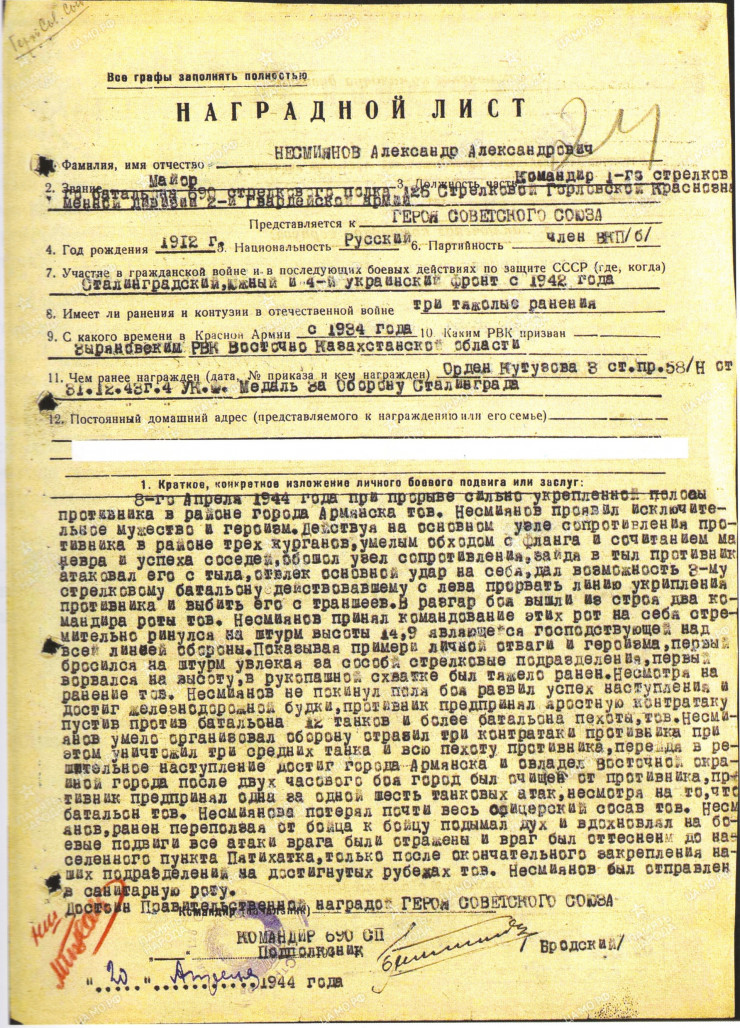 Второй раз к высокому званию героя Александра Несмиянова представили почти через год за подвиг, совершенный в боях возле Армянска (город на севере Крыма).