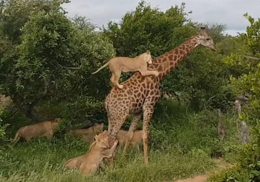 Гид национального парка Клазери в Южной Африке Франсуа Пьенар вместе с группой туристов стал свидетелем поразительного зрелища. Они увидели львов, которые после пробуждения начали преследовать большого самца жирафа. Сначала хищники присматривались к добыче и шли неспешно, а потом устроили настоящую гонку. Когда они настигли травоядное, то вцепились ему в ноги, а один лев даже запрыгнул на шею.