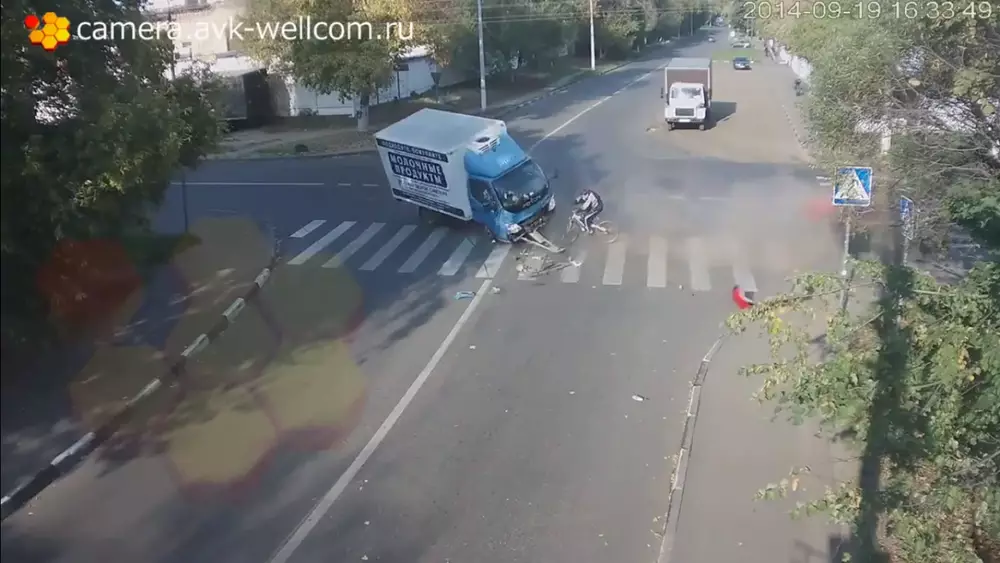 При этом от легкового автомобиля отлетает бампер, после чего она уезжает дальше и пропадает из кадра. В свою очередь, грузовик заваливается набок, а оказавшийся в самом центре этих жутких событий велосипедист не получает никаких повреждений. Как говорят в таких случаях, родился в рубашке.