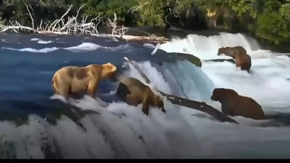 Камеры видеонаблюдения в национальном парке на юге Аляски (США) засняли группу медведей, которые пришли на реку полакомиться свежим лососем. Медведи поочередно пытались поймать прыткую рыбу, когда камера зафиксировала, как в попытке словить пастью подпрыгнувшего лосося один из медведей поскользнулся и упал в воду.