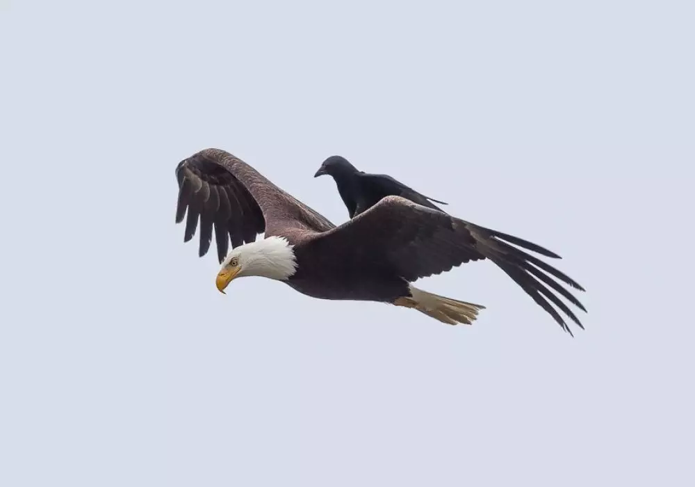 Фотограф Пхо Чан (Phoo Chan) сумел сфотографировать поездку ворона на орлане, сообщает AdMe.ru. Смелая птица подлетела к грозному хищнику сверху, села на него и продолжила полет в таком положении.