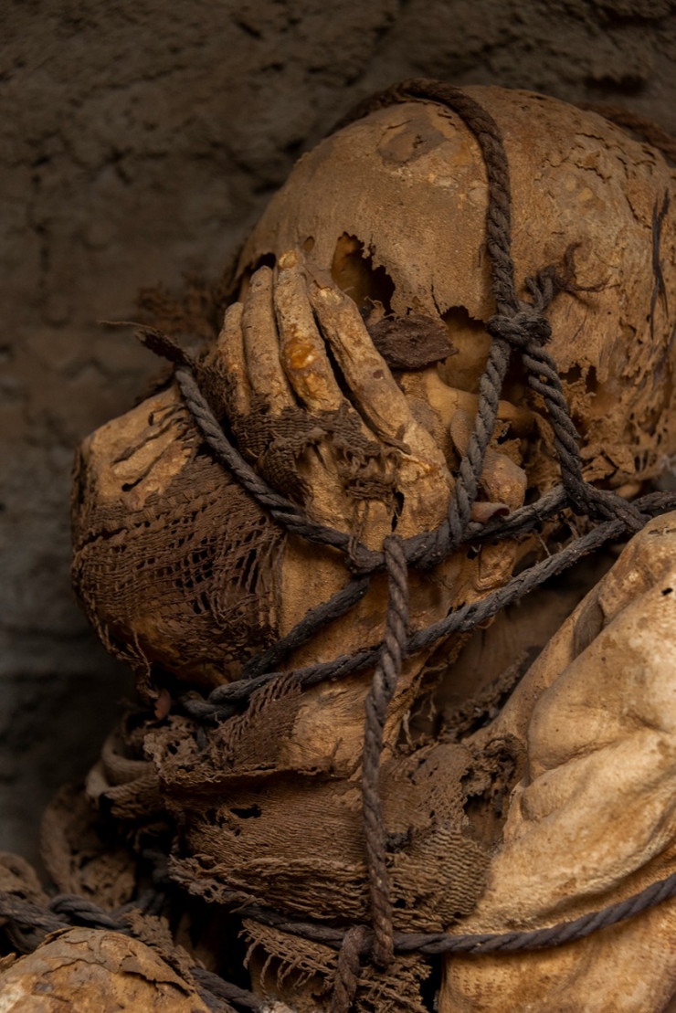 "Главной особенностью мумии является то, что все тело было связано веревками, а лицо закрыто руками", - сказал главный археолог из Калифорнийского университета Сан-Маркос Питер Ван Дален Луна.