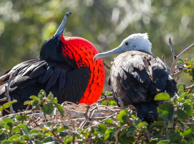Встретив свою половинку, фрегату нужно набрать побольше воздуха в легкие в буквальном смысле. Чтобы партнерша ответила взаимностью, он раздувает красный горловой мешок, похожий на огромное сердце. Сопровождая это взмахами крыльев и брачными песнопениями, он терпеливо ждет благосклонности партнерши. Если дама согласна, она трется головой о горловой мешок фрегата. И это значит, что брачный союз свершился.