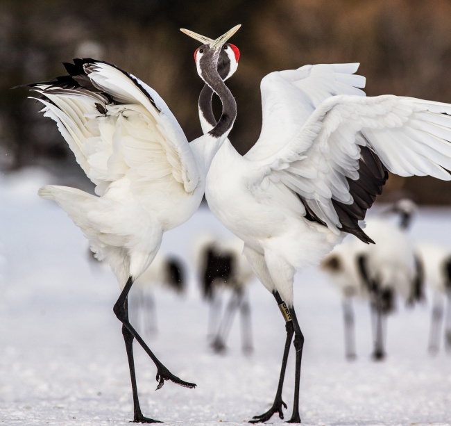 Ухаживания журавлей - это целый захватывающий ритуал. Тут и подпрыгивания с небольшими перебежками, и хлопанья крыльями с наклонами и пританцовываниями, и подбрасывания пучков травы вверх. В завершение состоявшаяся пара "закрепляет результат" совместным пением. И продолжает до тех пор, пока не начинает петь в унисон. Пожалуй, такое музыкальное единение среди людей можно встретить только в диснеевских фильмах.