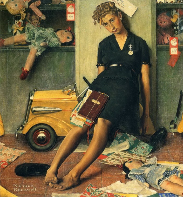 Картины Роквелла - настоящие мини-истории о повседневной жизни. Иной раз даже появляется ощущение, что иллюстрации буквально срисованы с нашей жизни. Если вы посмотрите внимательно, стрелки на часах продавщицы показывают 17:05 - уверены, она счастлива, что этот рабочий день наконец-то подошел к концу.
