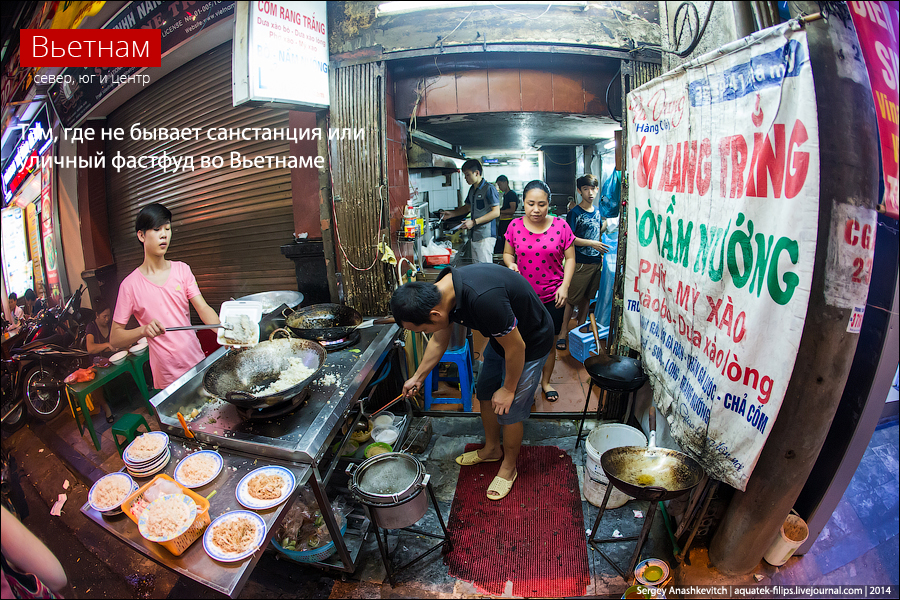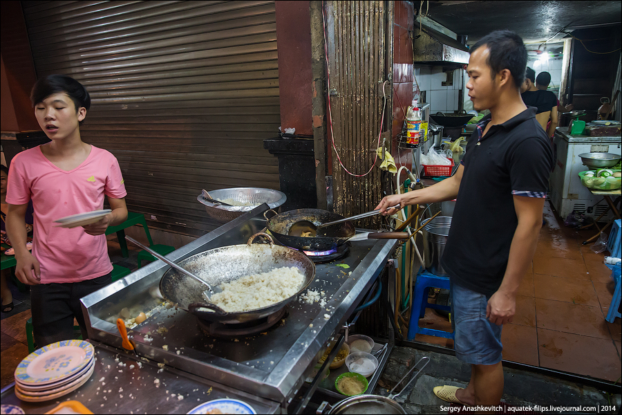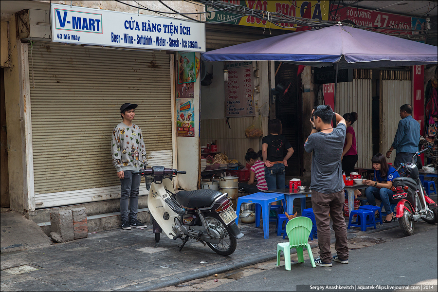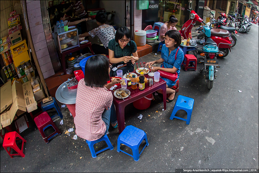 А теперь поговорим об уличных забегаловках. У нас бы их закрыли моментально, но не во Вьетнаме. Здесь всем совершенно наплевать на то, в каких условиях готовится еда и в каких условиях ее придется есть. Здесь главное, чтобы все это происходило на как можно более людной улице. Есть прямо на улице для вьетнамцем что-то вроде фетиша. В своих домах они практически не едят, норовят обязательно выйти со своим супом фо или миской рисовой лапши на людную улицу. И уже там уплетают еду за обе щеки, глазея по сторонам и переговариваясь со знакомыми и совершенно посторонними людьми. Поэтому уличные заведения в этой стране процветают - вечером в них, как правило, яблоку негде упасть. Несмотря на всю грязь и треш.