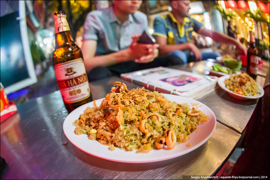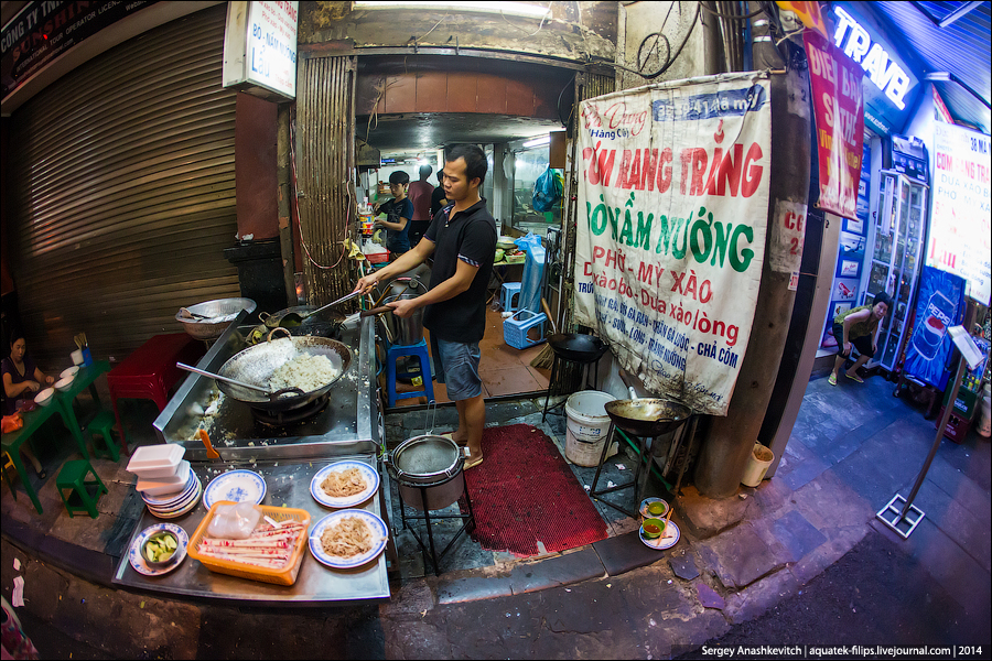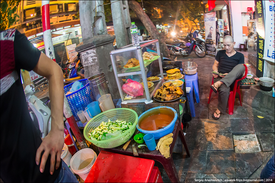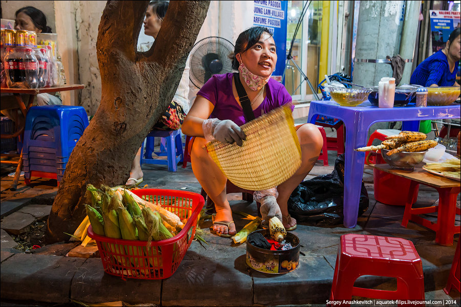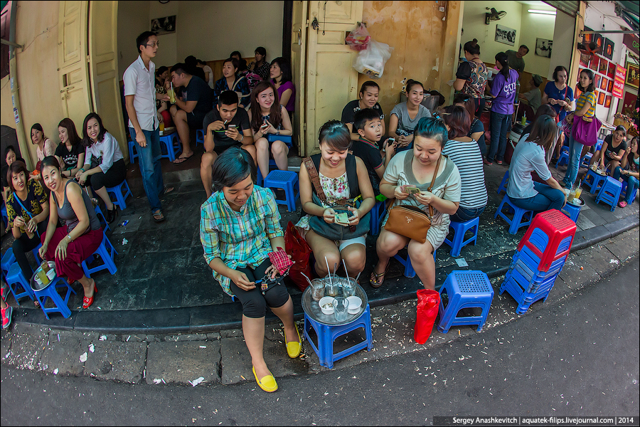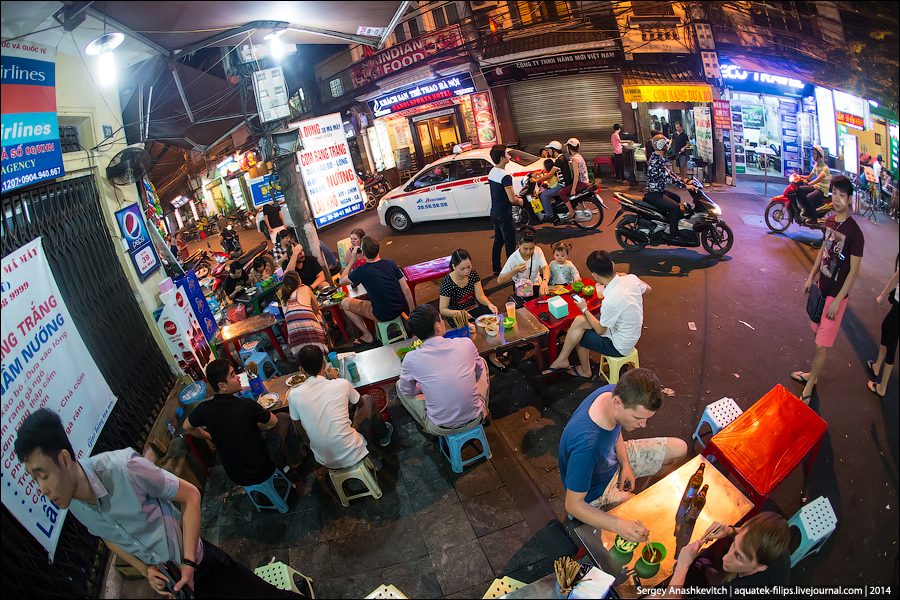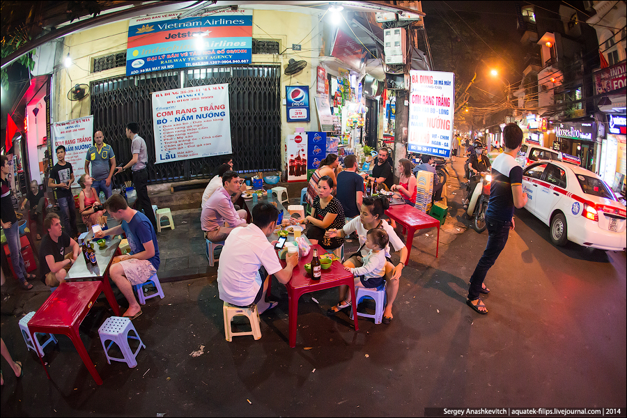 Уличных кафе так много, что кажется, будто одна половина вьетнамцев постоянно ест, а вторая постоянно эту еду готовит. Практически около каждого кафе в центре Ханоя работает зазывала. Его задача затащить посетителя именно в свое кафе. Зазывалы настойчивы и прекрасно говорят по-английски, ведь иностранные туристы лакомые клиенты для любого заведения - они не задумываясь оставляют здесь деньги за ужин, которые для них кажутся сущими копейками.