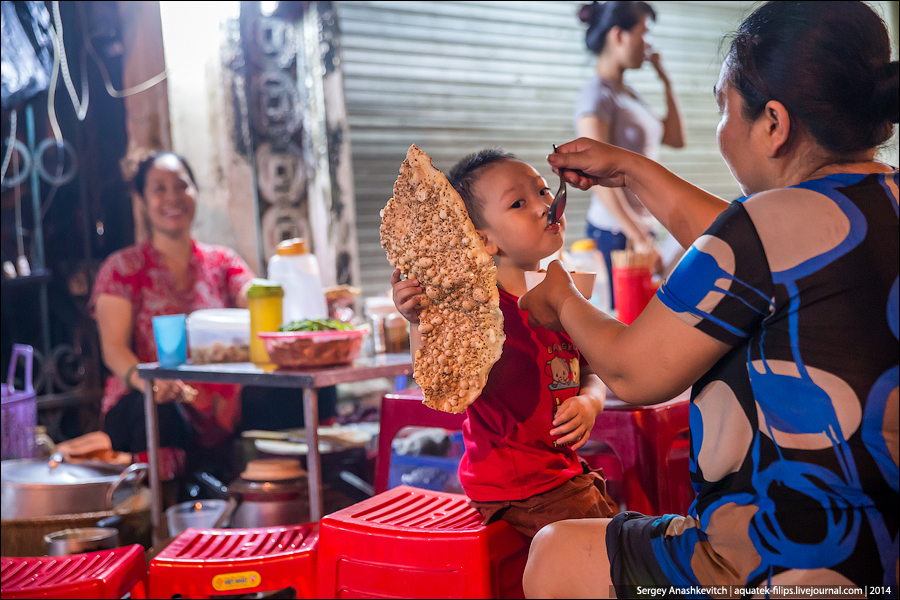Особая тема - уличное питание. Вьетнамцы обожают есть, сидя на улице. В Ханое просто огромное количество забегаловок, которые полностью занимают все тротуары и которые всегда полны народу, жующего разную снедь.