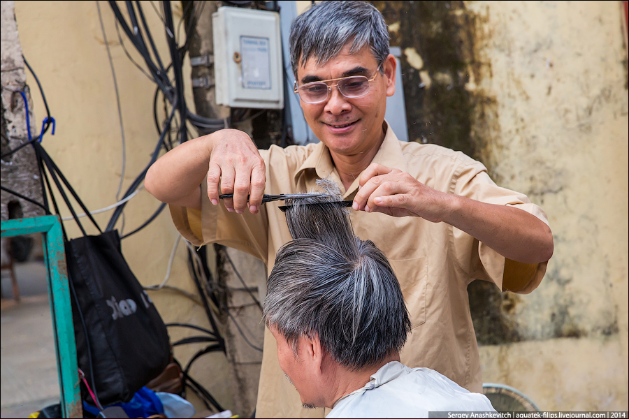 Вот уж где точно во Вьетнаме можно вкусить экзотики, так это в уличных парикмахерских. Нет, конечно, есть и вполне приличные салоны с красивыми вывесками и улыбчивыми вьетнамками, орудующими ножницами, но там цена за стрижку может доходить до 100 донгов (5 долларов), что очень дорого для простых вьетнамцев. Поэтому за 2 доллара можно постричься в hair-салоне, а за 1 доллар прямо на улице...