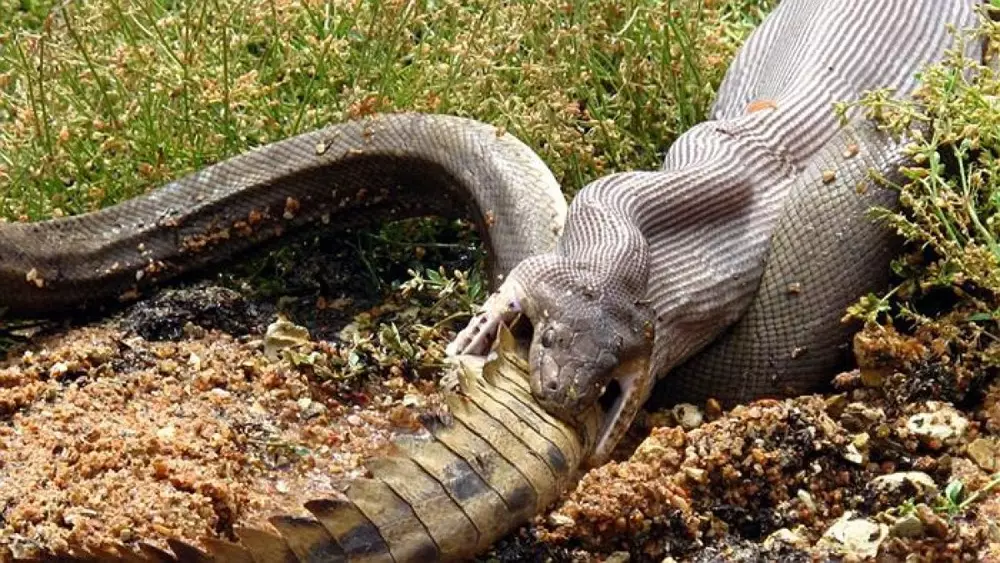 Огромная змея напала на крокодила на берегу пресноводного озера, обернувшись вокруг рептилии мощными кольцами. Крокодил долго бился, пытаясь освободиться. Но питон неумолимо сжимал жертву, пока та не задохнулась.