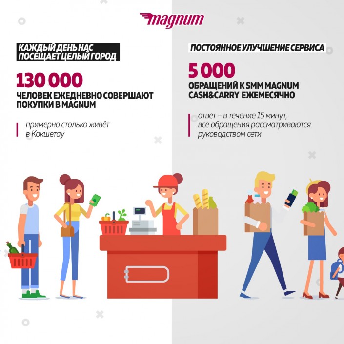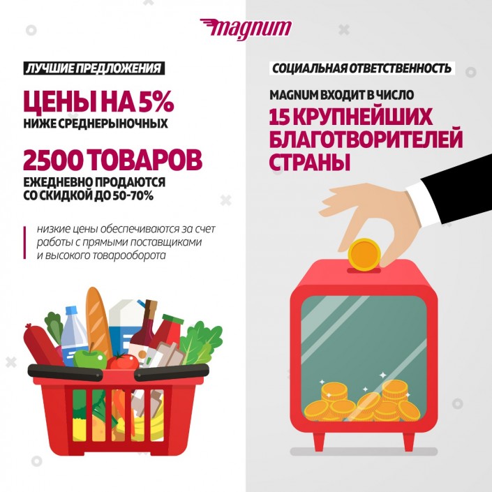 Компании Magnum Сash&Carry исполнилось 11 лет. 14 сентября 2007 года в Алматы был открыт первый магазин сети формата Сash&Carry (от английского "заплати и уноси" - формат магазинов самообслуживания). С латыни Magnum переводится как "большое, великое", и сегодня торгово-розничная сеть полностью соответствует своему названию. За прошедшие годы она стала крупнейшей в Казахстане и продолжает динамично развиваться благодаря своим любимым покупателям, выбирающим большой ассортимент, качество и цены от Magnum.