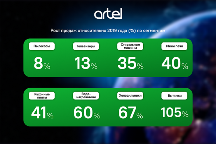 Компания Artel экспортировала бытовую технику на сумму более 80 миллионов долларов США за 2020 год. По сравнению с 2019 годом в показателях экспорта наблюдается значительный рост.