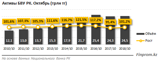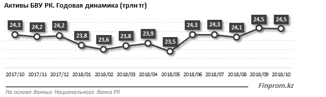 Активы банков Казахстана достигли 24,5 триллиона тенге на конец октября 2018 года, передает Tengrinews.kz со ссылкой на Finprom.kz.