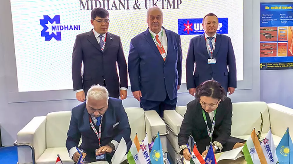 На выставке между АО "УКТМК" в лице президента компании Асем Мамутовой и государственным предприятием министерства обороны Индии компанией Mishra Dhatu Nigam Limited (MIDHANI) в лице председателя правления доктора Динеша Кумара Ликхи подписан меморандум о сотрудничестве, в рамках которого будут продолжены партнерские отношения в области производства титановых биоимплантов и медицинских инструментов.