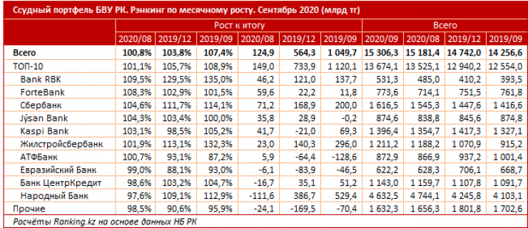 Bank RBK продолжает удерживать лидерство среди крупнейших казахстанских БВУ по темпам роста кредитного портфеля в текущем году. Несмотря на замедление экономики на фоне пандемии коронавируса, портфель банка по итогам сентября вырос на 9,5 процента за месяц, на 29,5 процента с начала года и на 35 процентов в годовом выражении, сообщает аналитическое агентство Ranking.kz.