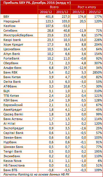 Лидерами 2016 года по объему заработанной прибыли стали Народный Банк и "Казком", на которых приходится 58 процентов всей прибыли банковского сектора - 123,5 миллиарда тенге у Народного и 107,6 миллиарда тенге у "Казкома". Значительно отстает от двойки лидеров "Ситибанк" с показателем в 28,8 миллиарда тенге.