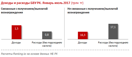 Также аналитики отмечают, что доходы БВУ РК, связанные с получением вознаграждения, за январь-июль 2017 года составили 1,5 триллиона тенге, расходы же составили 814,4 миллиарда тенге. Превышение доходов над расходами от основной деятельности в итоге составило 669,2 миллиарда тенге.