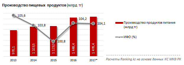 Всего в стране произвели продуктов питания на 627,9 миллиарда тенге - это на 9,8 процента больше, чем год назад. С учетом инфляции рост физического объема пищепрома составил 6,3 процента.