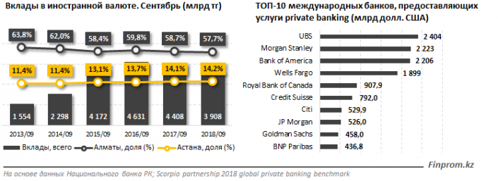 На конец сентября 2018 года срочные вклады физических лиц в иностранной валюте составляют 3,9 триллиона тенге - 52,5 процента от всех вкладов. Дедолларизация началась в 2015 году, тогда доля вкладов в инвалюте достигала 80,5 процента (4,2 триллиона тенге). Исторически максимальное значение вкладов в иностранной валюте зафиксировано в январе 2016 года - 83,9 процента (5,5 триллиона тенге).