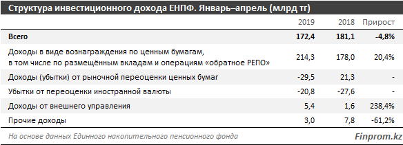 За четыре месяца текущего года чистый инвестиционный доход ЕНПФ составил 172,4 миллиарда тенге - на 4,8 процента меньше, чем за аналогичный период прошлого года (181,1 миллиарда тенге). Больше всего поступлений было получено за счет вознаграждения по ценным бумагам, в том числе по размещенным вкладам и операциям "обратное РЕПО" - 214,3 миллиарда тенге.