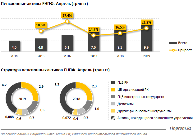 Общая сумма пенсионных активов на конец апреля 2019 года составила 9,9 триллиона тенге, увеличившись на 21,2 процента год к году. Основная доля в инвестиционном портфеле ЕНПФ приходится на государственные ценные бумаги Казахстана: 42,1 процента, или 4,2 триллиона тенге (годом ранее - 45,5 процента, или 3,7 триллиона тенге). Ценные бумаги организаций РК и ГЦБ иностранных государств равны 2,9 триллиона и 1,5 триллиона тенге, соответственно, доля - 28,9 процента и 15,1 процента. Депозиты в структуре инвестиционного портфеля ЕНПФ составили 6,8 процента, или 717,9 миллиарда тенге.