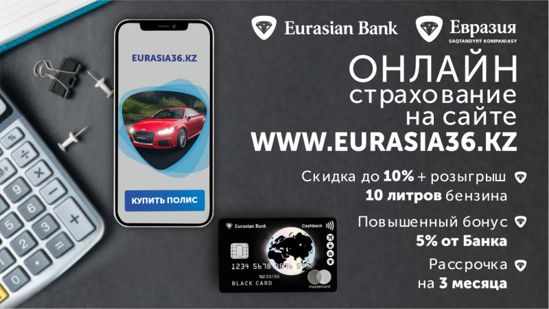 Покупая или продлевая полис обязательного автострахования (ОГПО ВТС) онлайн на сайте EURASIA36.kz и пользуясь дебетовой картой или картой рассрочки PayDA от Евразийского банка, каждый владелец автомобиля получает скидку до 10 процентов, высокий шанс выиграть 10 литров бензина, а также дополнительные 5 процентов повышенного бонуса от Евразийского банка. Акция также действует в офисах СК "Евразия" (рейтинг S&P BBB, kzAAA) при оплате страхового полиса безналичным путем по терминалу оплат. Более того, при оплате картой рассрочки PayDA от Евразийского банка предоставляется возможность оформить покупку страхового полиса с рассрочкой на 3 месяца.