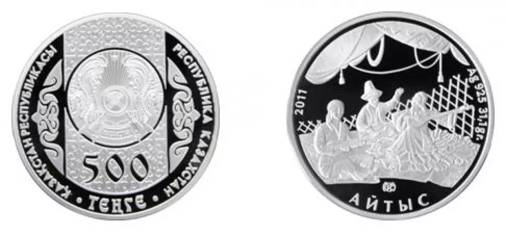 "Памятная монета "Айтыс" - шестая пара монет, продолжающая серию "Обряды, национальные игры Казахстана". Она сделана из серебра "proof"-качества номиналом 500 тенге и из сплава нейзильбер номиналом 50 тенге", - указывается в сообщении. Серебряная монета вышла тиражом в четыре тысячи экземпляров.
