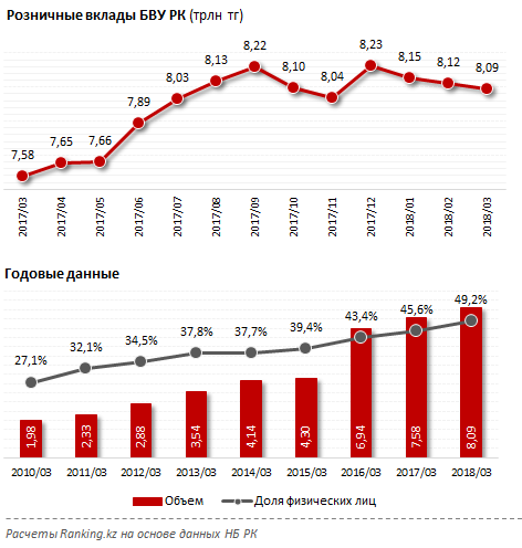 В январе отток по розничным вкладам составил 0,9 процента, в феврале-марте - 0,4 процента (35,4 миллиарда тенге). Сумма снизилась до 8,1 триллиона тенге. Общий депозитный портфель БВУ РК в этот же период сократился чуть меньше - на 0,2 процента (40,2 миллиарда тенге), до 16,4 триллиона тенге. Удельный вес розничных вкладов в общем портфеле незначительно уменьшился - с 49,3 процента до 49,2 процента.