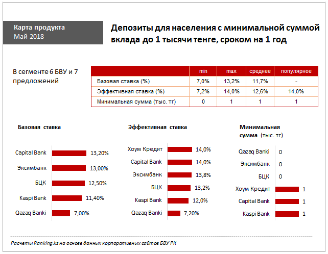Из 27 банков, предлагающих казахстанцам открыть розничные депозиты, только шесть банков позволяют открыть вклад с минимальной входной суммой до одной тысячи тенге.