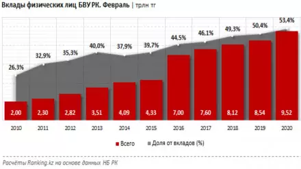 Таким образом, розничные вклады становятся все более и более значимыми в структуре фондирования казахстанских банков, занимая доминирующие 53,4 процента в совокупном объеме депозитов БВУ РК. Это исторический рекорд.