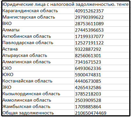 Антилидером в списке является Карагандинская область. Юридические лица региона имеют налоговую задолженность в размере почти 41 миллиарда тенге. В топ-10 налогоплательщиков, на которых приходится более трети общей суммы, входят по убыванию строители, торговые предприятия, рекламные агентства и компании по управлению недвижимостью.