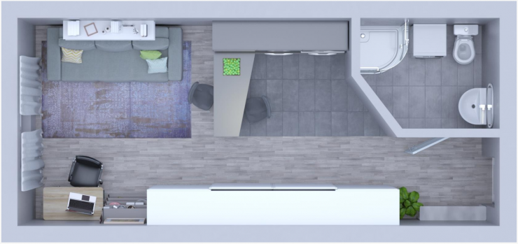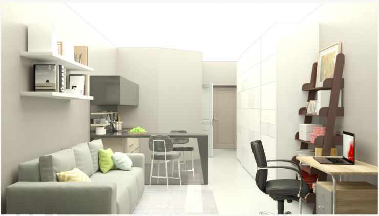 Общая площадь кампуса и прилегающей территории составит более 13,5 тысячи квадратных метров. В кирпичном жилом здании будет 9 этажей и 178 жилых комнат. Здесь единовременно смогут проживать 250-300 человек, предусмотрены семейные номера. Просторные комнаты вмещают в себя жилую и кухонную зоны, санузел.