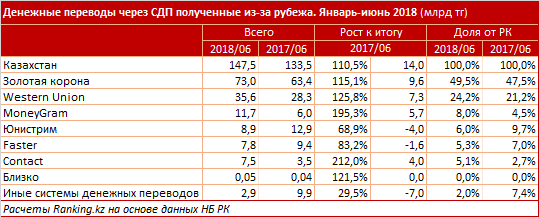 Больше всего переводов в РК было совершено через систему "Золотая корона" - 73 миллиарда тенге, что на 15,1 процента больше, чем в прошлом году. Доля системы выросла с 47,5 процента до 49,5.
