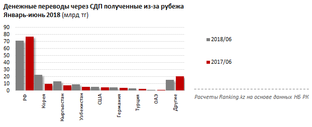 Больше всего денег было отправлено из России - 71,2 миллиарда тенге, что на 7,5 процента меньше, чем за январь-июнь 2017 года. Доля РФ упала с 57,7 процента до 48,3 процента.