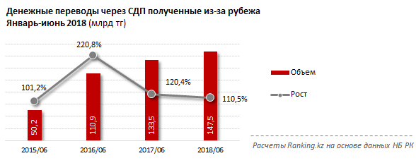 Объем денежных переводов, полученных населением из-за рубежа в РК через системы денежных переводов за январь-июнь 2018 года, составил 147,5 миллиарда тенге. Это на 10,5 процента больше, чем за аналогичный период прошлого года.