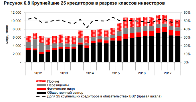 Похожая ситуация и на рынке депозитов. В Нацбанке поясняют, что проблема высокой концентрации ресурсной базы тесно связана с проблемой зависимости от государственного сектора. Предприятия государственного и квазигосударственного секторов являются основными крупными кредиторами, большая часть требований которых представлена в виде депозитов.