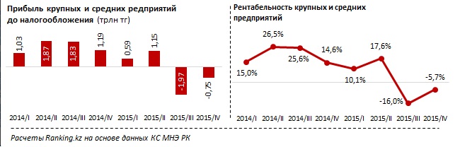 Эксперты сообщают, что четвертый квартал 2015 года оказался для компаний менее драматичным, чем третий, когда прибыль до налогообложения ушла в минус почти на 2 триллиона тенге, а рентабельность на 16 процентов. К концу года предприятия смогли переломить отрицательный тренд и компенсировать часть понесенных ранее убытков.