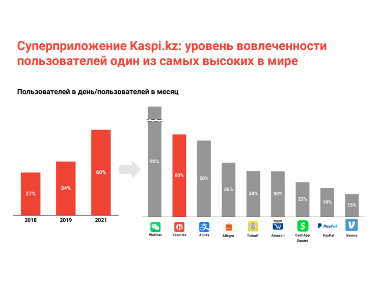 Суперприложением Kaspi.kz пользуются уже более 11 миллионов человек. Из них 6,5 миллиона заходят в приложение ежедневно. То есть из десяти человек шестеро используют мобильные сервисы Kaspi.kz ежедневно. Уровень вовлеченности составляет 60 процентов, и это один из самых высоких показателей в мире.