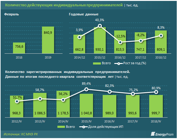 В целом по итогам третьего квартала 2018 года численность занятых в действующих ИП составила 1,3 миллиона человек - на 6,9 процента больше, чем годом ранее. Выпуск продукции за январь-сентябрь 2018-го составил 1,1 триллиона тенге, что на 6,6 процента меньше, чем за аналогичный период предыдущего года.