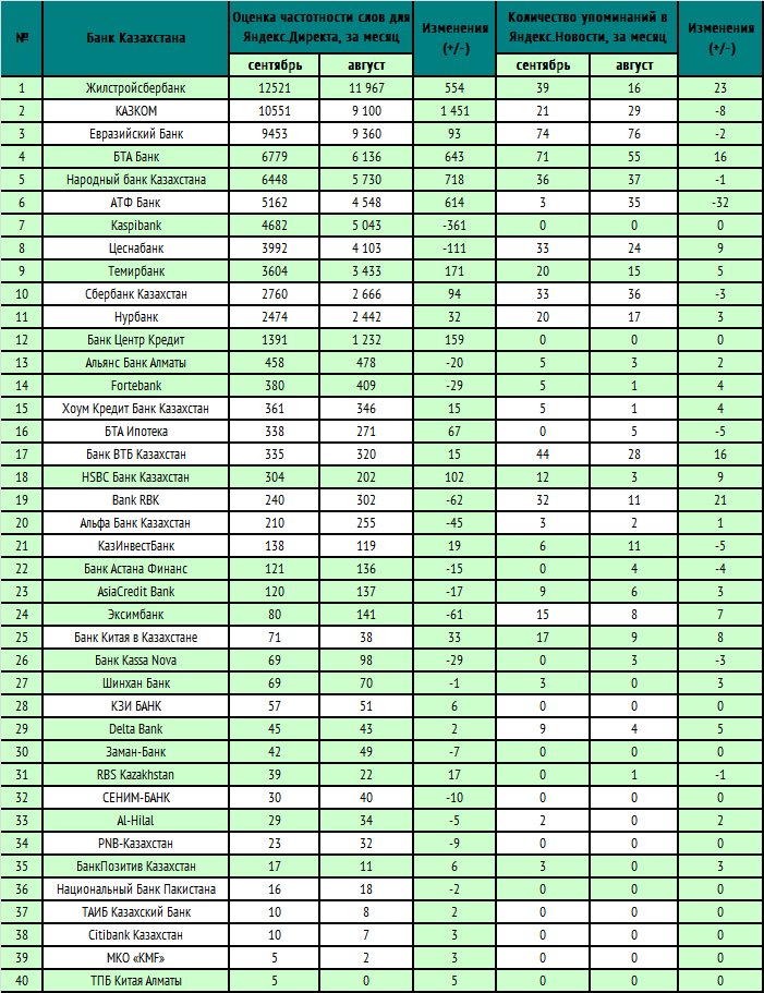 Журнал "Биржевой лидер" назвал самые популярные казахстанские банки по запросам в Интернете по состоянию на сентябрь 2014 года. Как отмечает издание, рейтинг был основан на двух объективных критериях в поисковой системе "Яндекс": оценке частотности слов, рассчитанной с помощью сервиса wordstat.yandex.ru, и на количестве упоминаний в интернет-СМИ и электронных информационных агентствах, рассчитанном при помощи агрегатора news.yandex.ru.