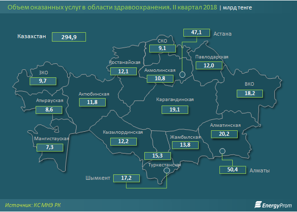 Традиционно наибольший объем услуг сконцентрирован в столицах, где находится большинство общереспубликанских медицинских центров - 33 процента от РК. Также в тройке лидеров - Алматинская область (6,9 процента от РК).