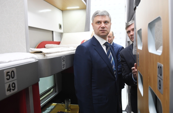 Председатель правления ОАО "РЖД" Олег Белозеров осматривает макет нового плацкартного вагона. © РИА Новости/Илья Питалев