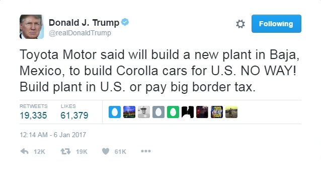 Он написал, что Toyota планирует построить новый завод в одном из мексиканских штатов, где будут собираться автомобили Corolla для США. Однако призвал компанию перенести строительство в Америку. В противном случае Трамп пообещал ввести высокий налог на импорт продукции автоконцерна.