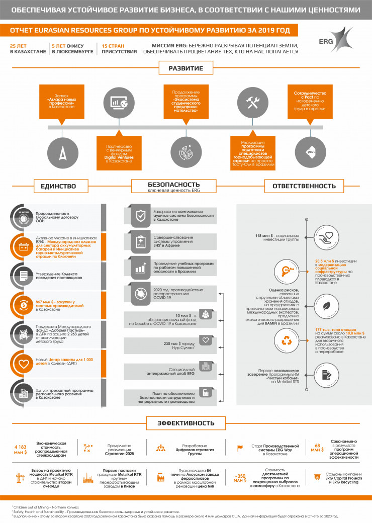 Ведущая диверсифицированная компания в сфере добычи и переработки природных ресурсов Eurasian Resources Group опубликовала отчет по устойчивому развитию за 2019 год. В нем отражены ключевые достижения Группы и информация о результатах ее деятельности в сфере устойчивого развития, направленной на создание ценности для стейкхолдеров в долгосрочной перспективе.