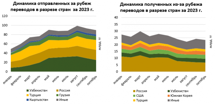 "Исходящие трансграничные переводы без открытия банковского счета через СМДП в основном осуществляются с Узбекистаном (28,9 процента), Россией (24,2 процента), Турцией (22,9 процента), Грузией (9,5 процента) и Кыргызстаном (3,4 процента). Переводы за рубеж осуществляются как казахстанцами, так и иностранными гражданами, которые могут находиться на территории страны в целях заработка.