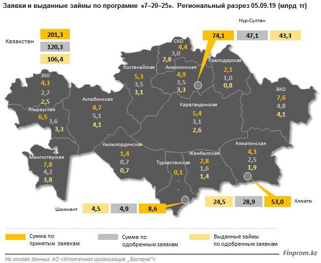 В Казахстане функционируют специальные ипотечные программы, целью которых является повышение уровня обеспеченности населения жильем. Одна из них "7-20-25". В ней участвуют восемь банков. По состоянию на 5 сентября на участие в программе подали заявки 17,8 тысячи человек. Сумма заявок составила 201,3 миллиарда тенге, из них было одобрено 10,5 тысячи заявок на сумму 120,3 миллиарда. Общий процент одобрения заявок составил 58,9 процента.