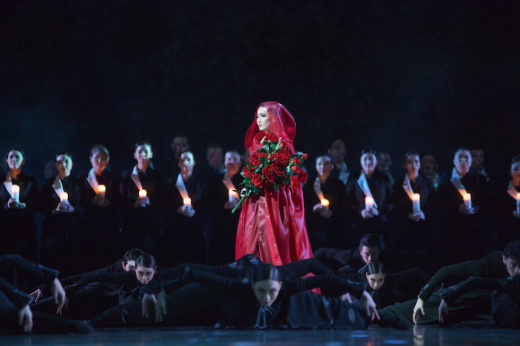 В этой масштабной сцене был занят весь творческий коллектив театра "Астана Опера". Впервые в истории балета артисты хора стали полноценными участниками балетного спектакля. Фигуры, созданные ими на сцене, завораживали своими четкими линиями. Артисты балета, хора, миманса, солисты оперы, музыканты оркестра создали по-настоящему захватывающее зрелище.